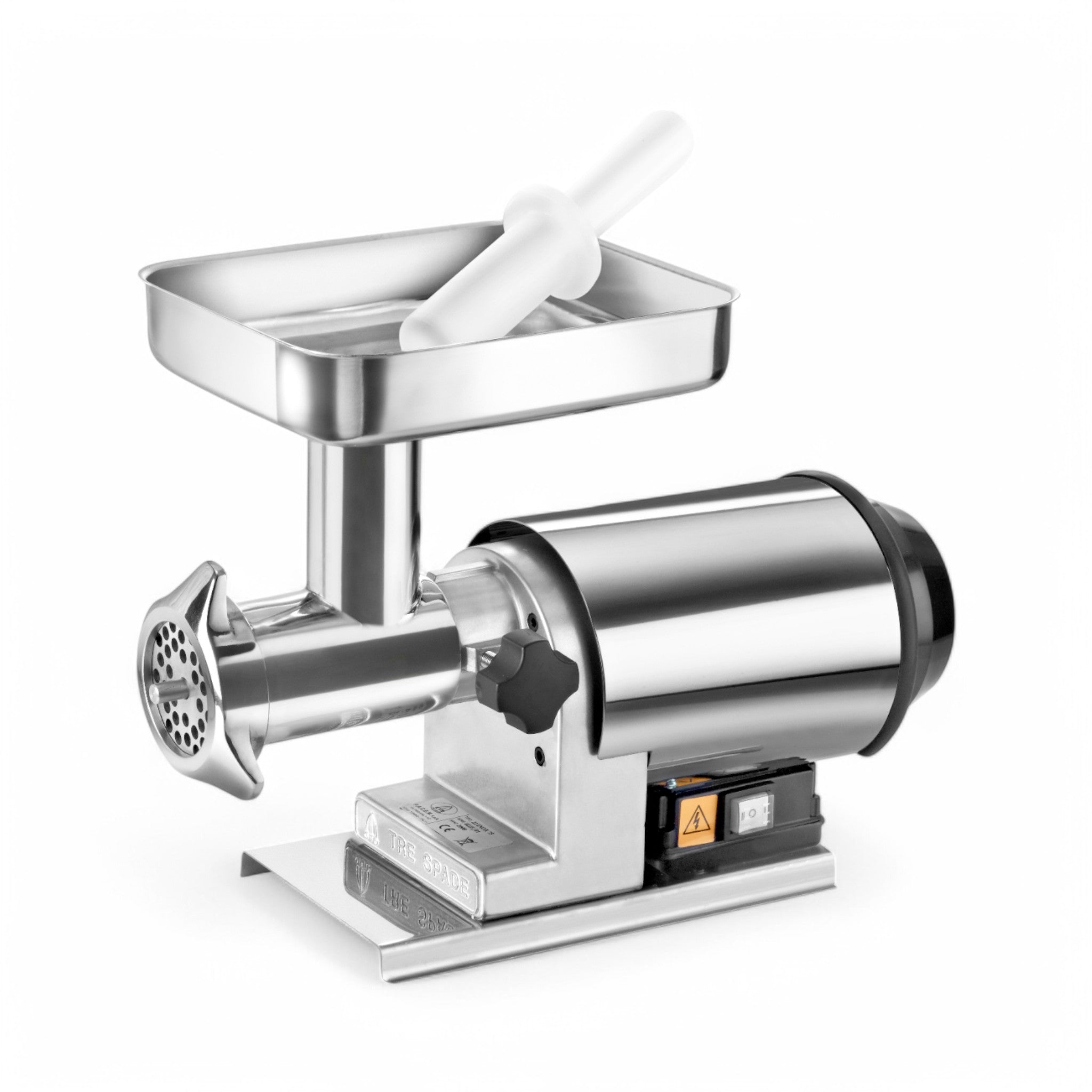 Le hachoir électrique TC 22 INOX 0,80 HP de Tre Spade est conçu pour ceux qui recherchent un appareil extrêmement robuste, fiable et puissant. Entièrement réalisé en acier inoxydable, il est idéal pour traiter fréquemment et sans effort de grandes quantités de viande, permettant d’obtenir des hamburgers, de la viande hachée fraîche et des saucisses de qualité excellente.