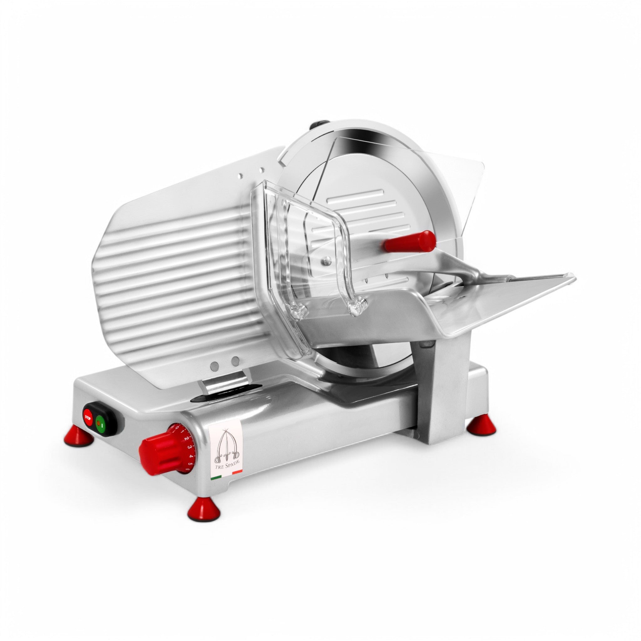 Sa structure en aluminium moulé sous pression, associée à des composants en aluminium anodisé, garantit une hygiène optimale, une excellente résistance et un nettoyage facile. Sa lame professionnelle de 27,5 cm en acier trempé et chromé permet de trancher avec précision tous types d’aliments, avec un réglage d’épaisseur de coupe de 0 à 15 mm. Le moteur asynchrone de 150 W assure des performances fiables et continues, tandis que l'affûteur amovible facilite un entretien rapide et efficace.