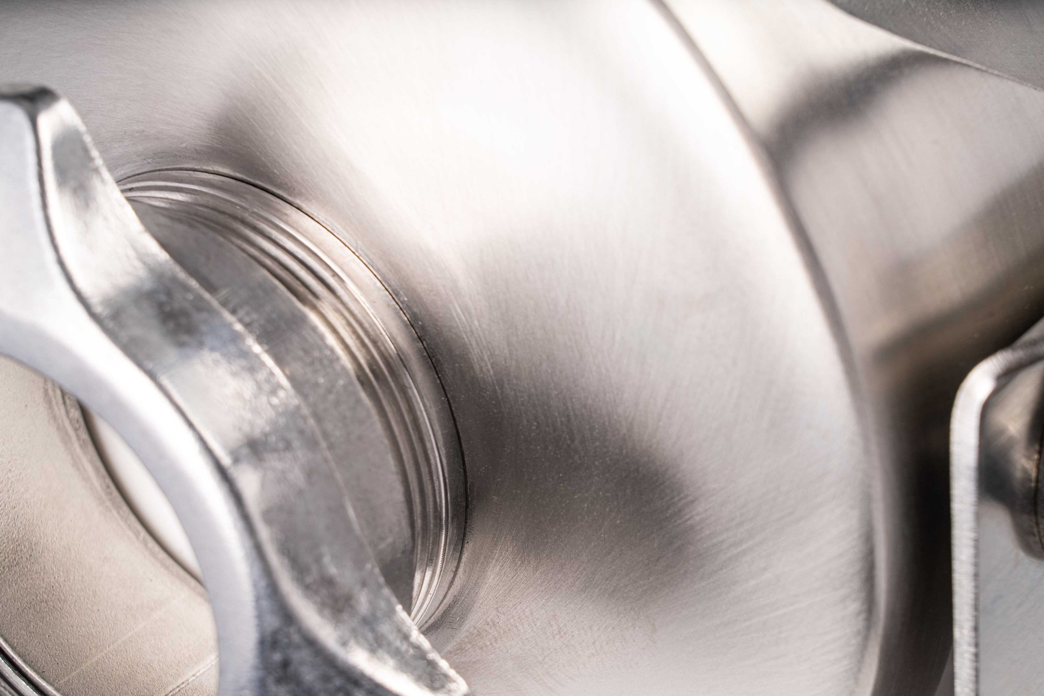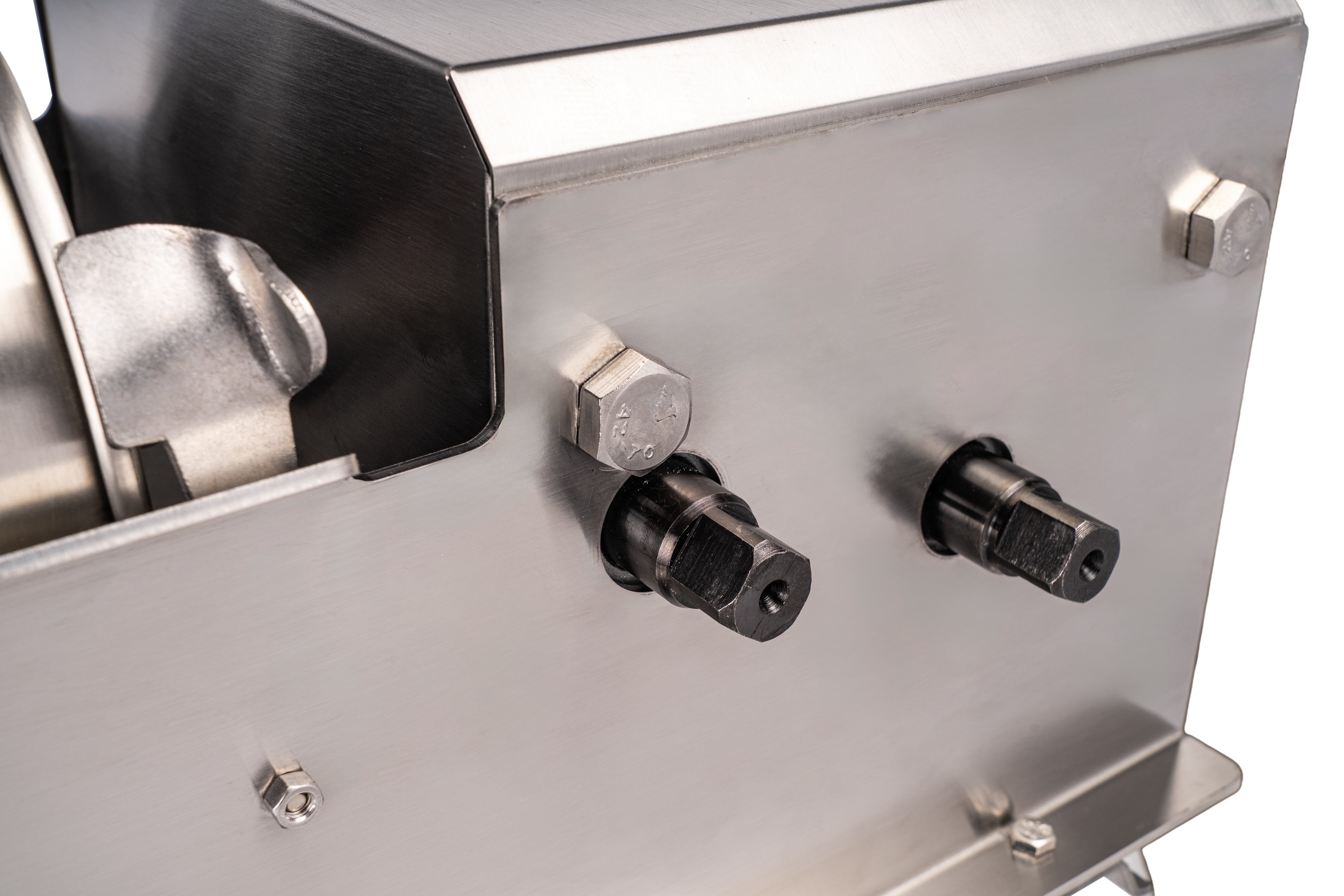 Konstruktion i rostfritt stål: Cylinder, sidopaneler, skruvar, kuggstång och fötter i rostfritt stål för att säkerställa robusthet, hygien och lång hållbarhet